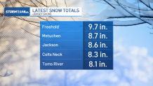 The heaviest snow fell across New Jersey, with Freehold leading the way with 9.7”. Parts of Middlesex, Monmouth & Ocean County also topped 8 inch mark. 7-9” totals were also reported in Long Island, with Commack recording 8.5”.