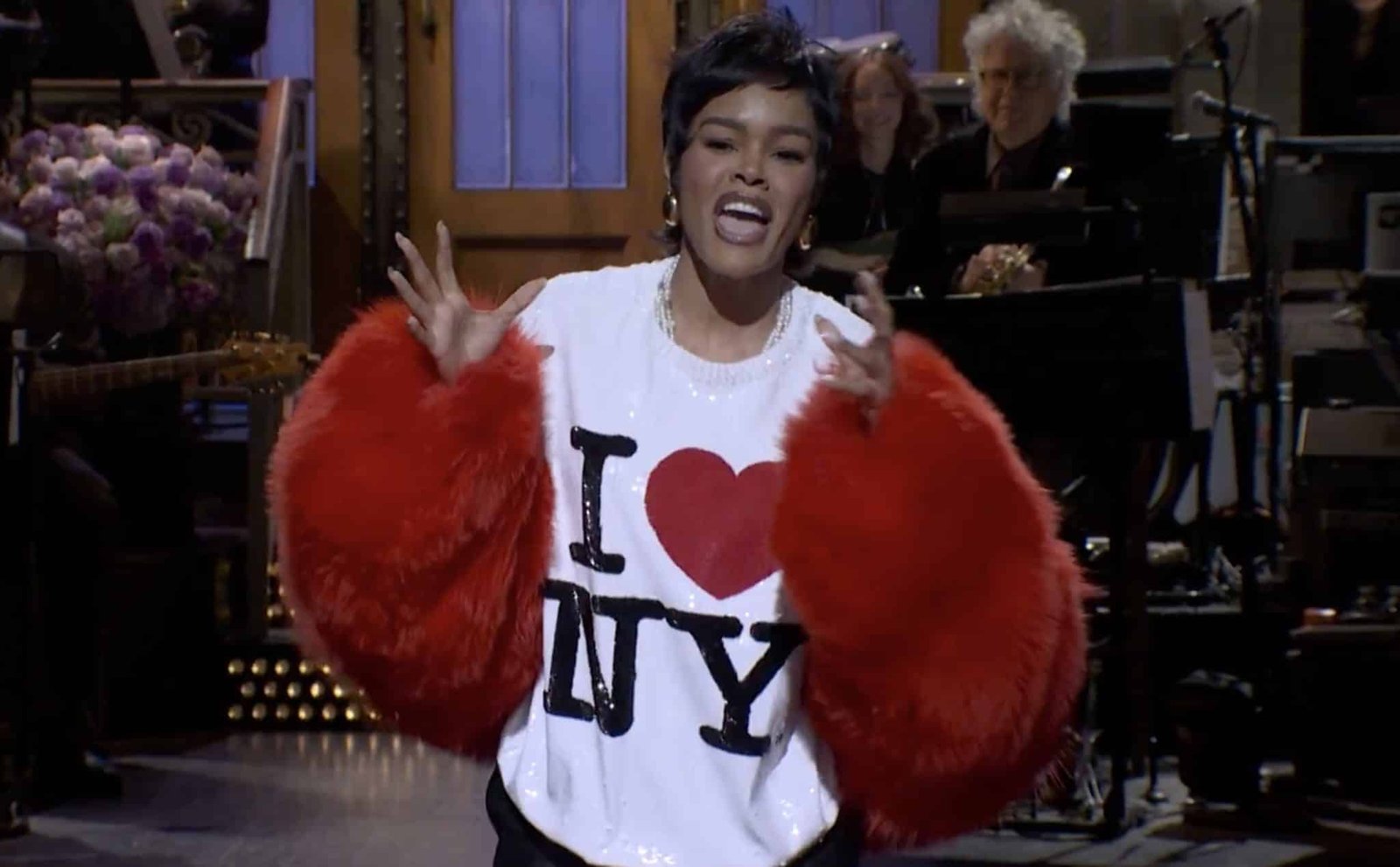 The contrast between the plush outerwear and the graphic top created a visually striking look designed to read clearly from the SNL stage.