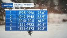 The city would still need to see nearly 20 more inches this season to crack the top 5 all-time snowiest winters. The last winter to crack the top of the charts was in 2011.