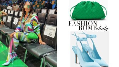 Eudoxie Posed Courtside in a Multicolored Pucci Ensemble with a Green Bottega Veneta Bag and Powder Blue The Attico Heels – Fashion Bomb Daily